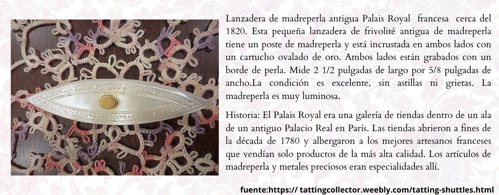 El "Knotting" del Siglo XVIII: El antepasado directo y verificable del Frivolité es el Knotting (anudado). En el siglo XVIII, las damas de la aristocracia europea usaban navetas (shuttles) mucho más grandes que las actuales para crear cordones decorativos con nudos. Estos cordones luego se cosían sobre telas para adornar vestidos o muebles.